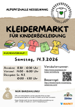 Am Samstag, den 14. März 2026 findet von 14-16 Uhr der Nesselwanger Kinderkleidermarkt in der Alpspitzhalle Nesselwang statt. Verkauf von gut erhaltener Kinderkleidung in den Größen 50-176, Schuhe, Spielsachen, Bücher, Babysachen etc.