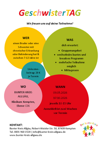 WER: einen Bruder oder eine Schwester mit chronischer Erkrankung oder Behinderung hat & zwischen 7-12 Jahre ist Unkostenbeitrag: 20 € je Termin