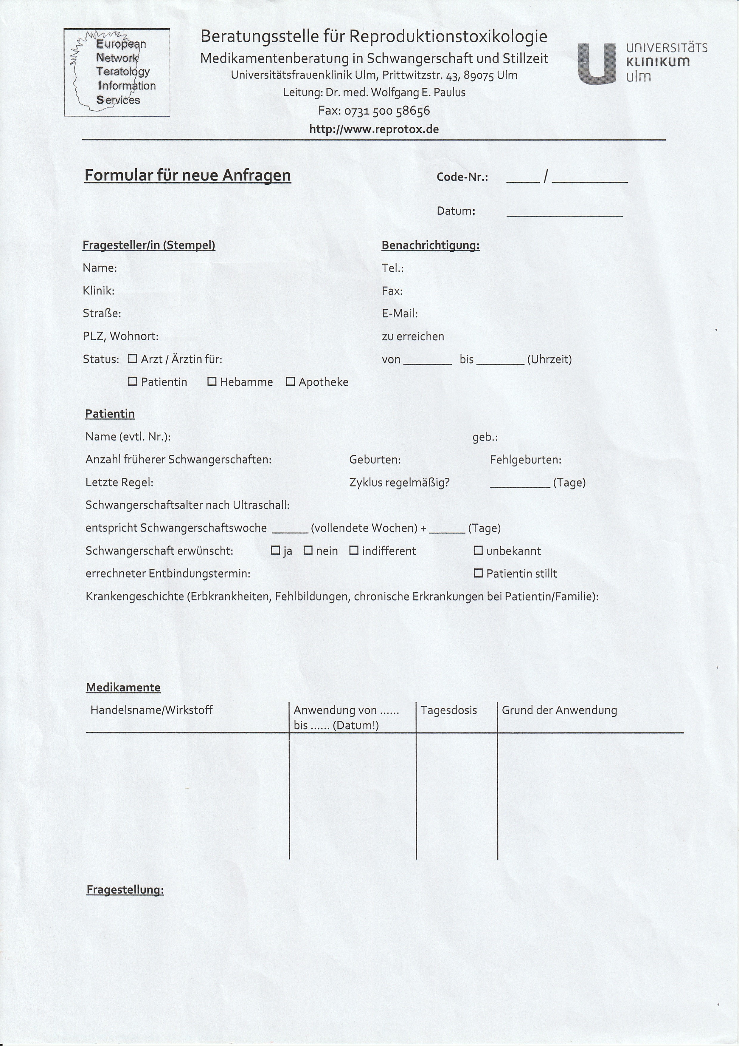 Online Formular: https://www.uniklinik-ulm.de/frauenheilkunde-und-geburtshilfe/schwerpunkte/geburtsmedizin/medikamentenberatung/online-anfrageformular.html