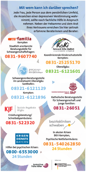 Wir, das sind fachkundige Beraterinnen der KoKis Kempten und Oberallgäu, der Beratungsstellen für Schwangerschaftsfragen des Landratsamtes, der pro familia und des Sozialdienstes katholischer Frauen, der Erziehungsberatungsstelle/Schreibabyberatung der Katholischen Jugendfürsorge und der Beratungsstelle des Familienzentrums Immenstadt.